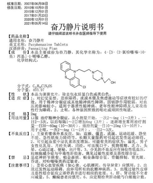 - 本頁面信息僅供參考,請以產(chǎn)品實際附帶說明書為準。 奮乃靜片 (顏山)外包裝 奮乃靜片 (顏山)說明書 公司