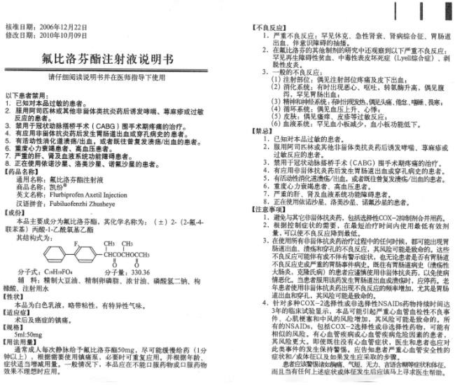 - 本頁(yè)面信息僅供參考,請(qǐng)以產(chǎn)品實(shí)際附帶說(shuō)明書為準(zhǔn)。 凱紛氟比洛芬酯注射液 外包裝 凱紛 氟比洛芬酯注射液 說(shuō)明書 (2010版