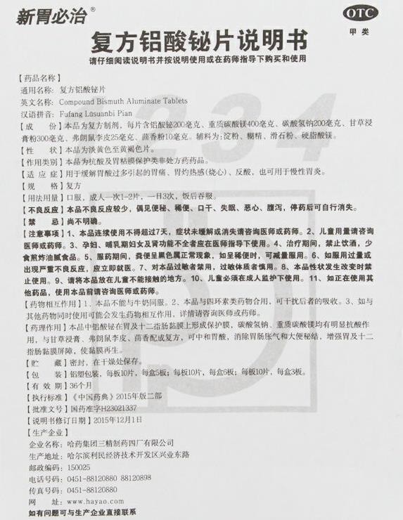 - 本頁(yè)面信息僅供參考,請(qǐng)以產(chǎn)品實(shí)際附帶說(shuō)明書(shū)為準(zhǔn)。 哈藥新胃必治1234 復(fù)方鋁酸鉍片 說(shuō)明書(shū)圖片版 哈藥新胃必治1234 復(fù)方鋁酸