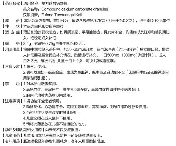 - 本頁(yè)面信息僅供參考,請(qǐng)以產(chǎn)品實(shí)際附帶說(shuō)明書為準(zhǔn)。 力之助 復(fù)方碳酸鈣顆粒 說(shuō)明書 文字版 【藥品名稱】復(fù)方碳酸鈣顆粒 【