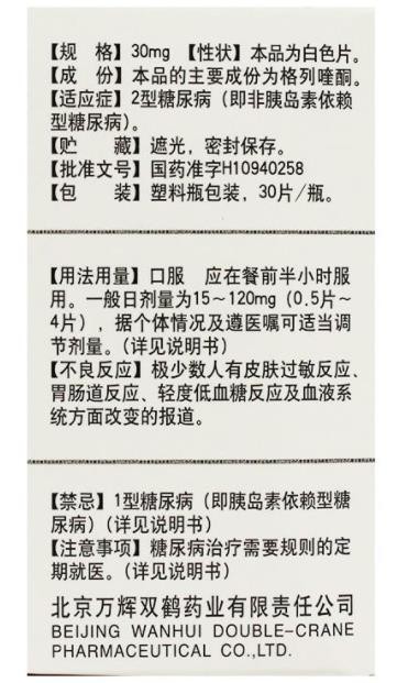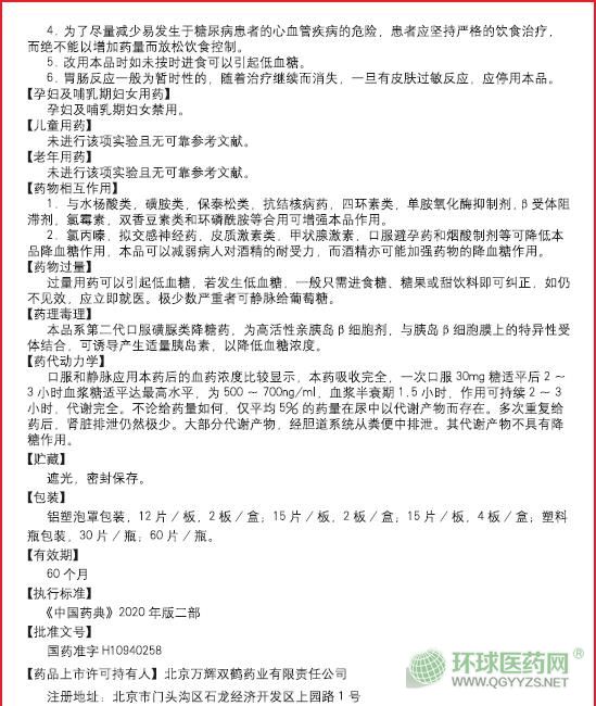 【用法用量】餐前服用。根據(jù)患者個體情況,可適當(dāng)調(diào)節(jié)劑量,一般日劑量為15-180mg(半片-6片)。日劑量30mg(1片)以內(nèi)者可于早餐前一次服用。大于此劑量者可酌情分為早、晚或早、中、晚分次服用。開始治療量應(yīng)從15-30mg(半片-1片)開始,根據(jù)血糖情況逐步加量,每次加量15-30mg(半片-1片)。如原已服用其他磺酰脲類藥改用本品時,可按相同量開始,按上述量逐漸加量調(diào)整。日最大劑量一般不超過180mg(6片)。