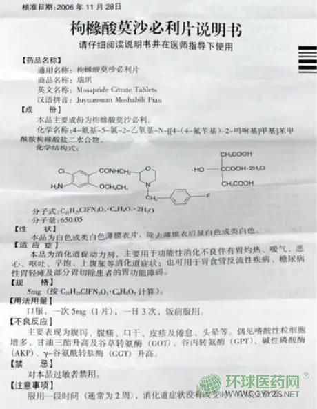 【藥品名稱】通用名稱:枸櫞酸莫沙必利片