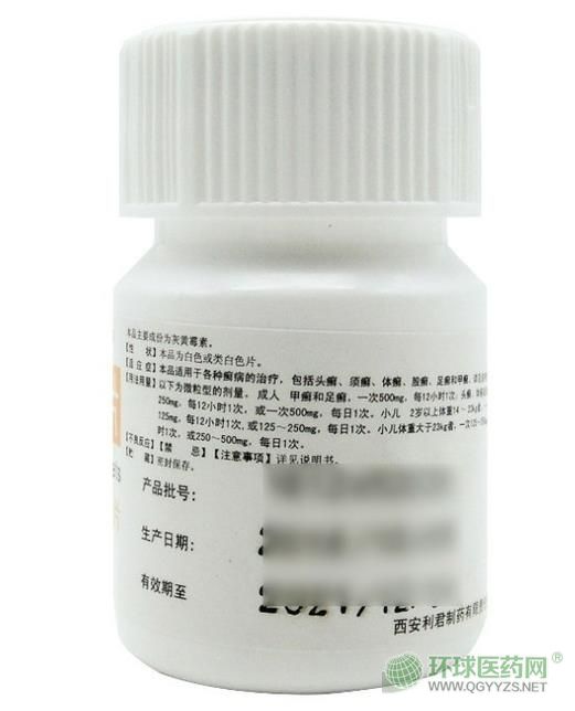 【用法用量】以下為微粒型的劑量。成人甲癬和足癬,一次500mg,每12小時1次;頭癬、體癬或股癬,一次250mg,每12小時1次,或一次500mg,每日1次。小兒2歲以上體重14~23kg者,一次62.5~125mg,每12小時1次,或125~250mg,每日1次。小兒體重大于23kg者,一次125~250mg,每12小時1次,或250~500mg,每日1次。