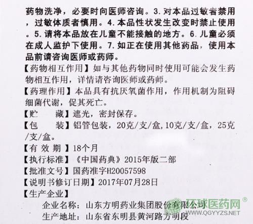 - 本頁(yè)面信息僅供參考,請(qǐng)以產(chǎn)品實(shí)際附帶說明書為準(zhǔn)。 方明藥業(yè) 甲硝唑凝膠 說明書文字版 暫無 方明藥業(yè) 甲硝唑凝膠 說明書圖片版