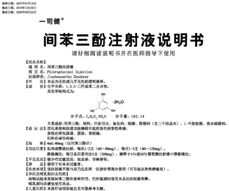 - 本頁(yè)面信息僅供參考,請(qǐng)以產(chǎn)品實(shí)際附帶說明書為準(zhǔn)。 一司健 間苯三酚注射液 外包裝 一司健 間苯三酚注射液 說明書(2020年版)