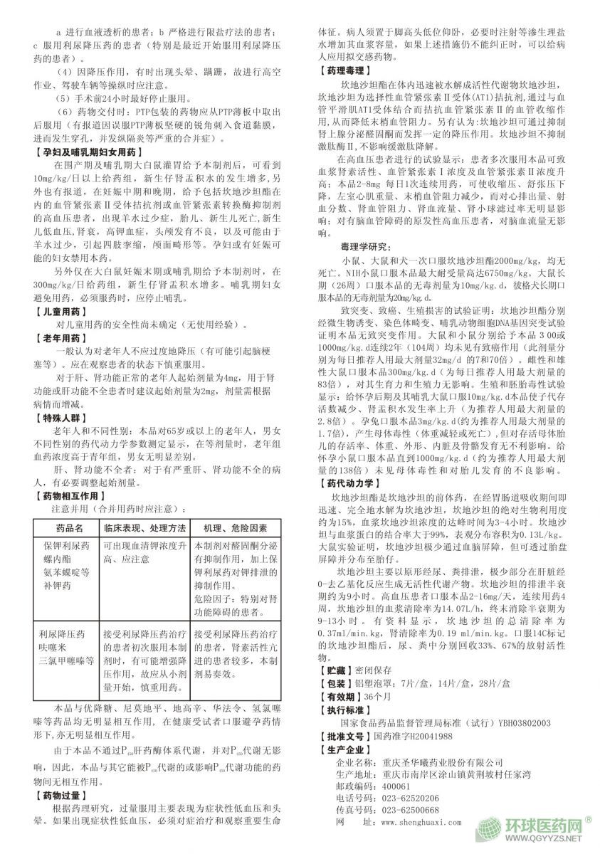 - 本頁面信息僅供參考,請以產(chǎn)品實際附帶說明書為準。 重慶圣華曦 坎地沙坦酯片 說明書文字版 見以下圖片版 重慶圣華曦 坎地沙坦酯