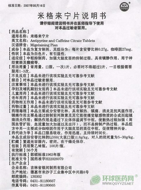 漢語拼音:Migelaining Pian英文名稱:Antipyriine and Caffeine Citrate Tablets