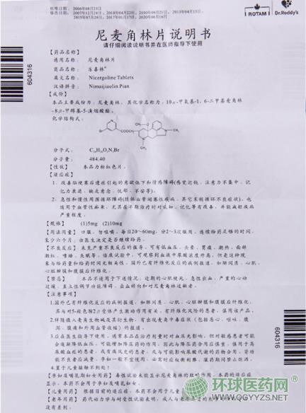 【成份】尼麥角林 化學(xué)名稱為:10-甲氧基-1,6-二甲基麥角林-8-甲醇基-5-溴煙酸酯。分子式:C24H26O3N3Br分子量:484.39