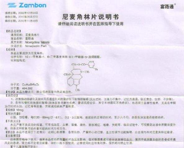 西藥、處方藥、醫(yī)保乙類!具m應(yīng)癥】1、改善腦動脈硬化及腦中風(fēng)后遺癥引起的意欲低下和情感障礙(反應(yīng)遲鈍、注意力不集中、記憶力衰退、缺乏意念、憂郁、不安等)。2、急性和慢性周圍循環(huán)障礙(肢體血管閉塞性疾病、雷諾氏綜合癥、其它末梢循環(huán)不良癥狀)。也適用于血管性癡呆,尤其在早期治療時對認知、記憶等有改善,并能減輕疾病嚴重程度。多家企業(yè)生產(chǎn)。目前海南贊邦制藥有限公司、昆山龍燈瑞迪制藥有限公司在環(huán)球醫(yī)藥網(wǎng)招商。【藥品名稱】通用名稱:尼麥角林片