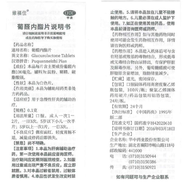 - 本頁面信息僅供參考,請以產(chǎn)品實際附帶說明書為準(zhǔn)。 華中藥業(yè) 葡醛內(nèi)酯片 說明書圖片版 華中藥業(yè) 葡醛內(nèi)酯片 說明書文字版