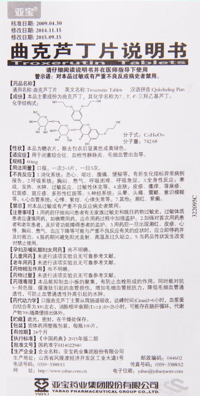 - 本頁(yè)面信息僅供參考,請(qǐng)以產(chǎn)品實(shí)際附帶說明書為準(zhǔn)。 曲克蘆丁片 (維腦路通片)外包裝 山西亞寶曲克蘆丁片(維腦路通片)說明書(