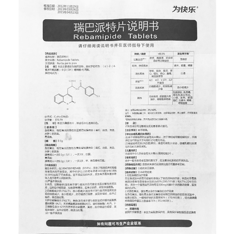 - 本頁(yè)面信息僅供參考,請(qǐng)以產(chǎn)品實(shí)際附帶說(shuō)明書(shū)為準(zhǔn)。 浙江遠(yuǎn)力健為快樂(lè) 瑞巴派特片 外包裝 浙江遠(yuǎn)力健為快樂(lè) 瑞巴派特片 說(shuō)明書(shū)