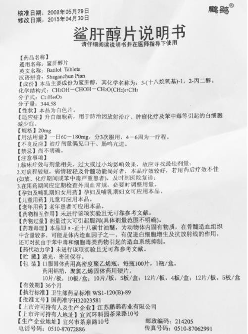 西藥、處方藥、醫(yī)保乙類。用于防治因放射治療、腫瘤化療及苯中毒等引起的白細胞減少癥。有十七家企業(yè)生產鯊肝醇片。目前海南益爾藥業(yè)有限公司、江蘇鵬鷂藥業(yè)有限公司、上海信誼萬象藥業(yè)股份有限公司在環(huán)球醫(yī)藥網招商。【藥品名稱】