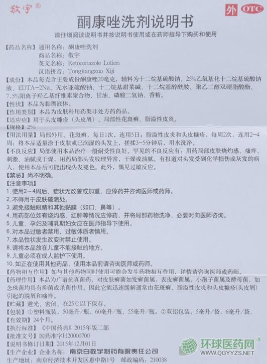 - 本頁(yè)面信息僅供參考,請(qǐng)以產(chǎn)品實(shí)際附帶說(shuō)明書(shū)為準(zhǔn)。 采樂(lè) 酮康唑洗劑 50ml外包裝 采樂(lè)酮康唑洗劑50ml說(shuō)明書(shū) (2014版)