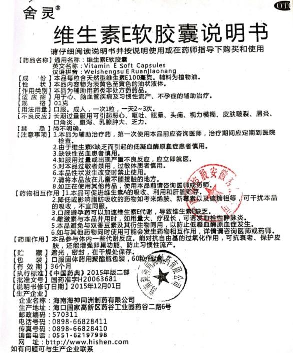 西藥、OTC甲類、醫(yī)保甲類。用于心、腦血管疾病及習(xí)慣性流產(chǎn)、不孕癥的輔助治療。多家企業(yè)生產(chǎn)。深圳市奧瑞康生物科技有限公司、無錫錫新醫(yī)藥有限公司、合肥安爾吉藥業(yè)有限公司等企業(yè)在環(huán)球醫(yī)藥網(wǎng)招商。【藥品名稱】通用名稱:維生素E軟膠囊