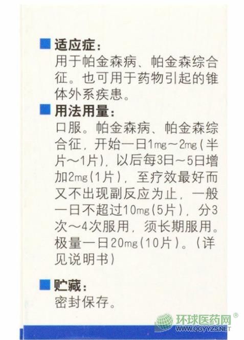 【用法用量】口服帕金森病、帕金森綜合征,開始一日1~2mg(半片~1片),以后每3~5日增加2mg(1片),至療效最好而又不出現(xiàn)副反應(yīng)為止,一般一日不超過10mg(5片),分3~4次服用,須長期服用。極量一日20mg(10片)。藥物誘發(fā)的錐體外系疾患,第一日2~4mg(1~2片),分2~3次服用,以后視需要及耐受情況逐漸增加至5~10mg(2.5~5片)。老年患者應(yīng)酌情減量。
