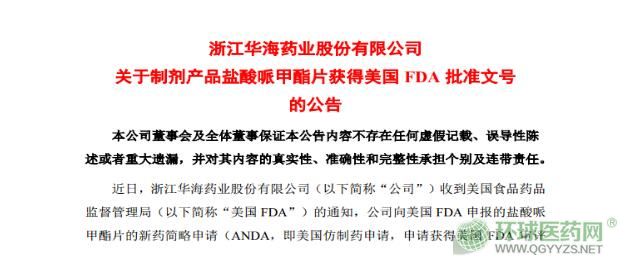- 近日,浙江華海藥業(yè)股份有限公司(以下簡稱“公司”)收到美國食品藥品監(jiān)督管理局的通知,公司向美國FDA申報的鹽酸哌甲酯片的新藥簡略申請