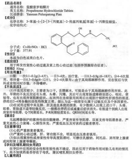 【成份】本品主要成份為鹽酸普羅帕酮。