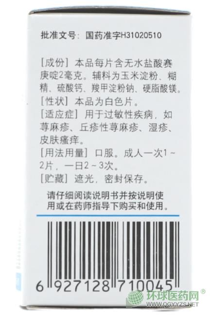 西藥、OTC甲類、醫(yī)保甲類。用于過敏性疾病,如蕁麻疹、丘疹性蕁麻疹、濕疹、皮膚瘙癢。多家企業(yè)生產(chǎn)。目前安徽華源醫(yī)藥股份有限公司在環(huán)球醫(yī)藥網(wǎng)招商。【藥品名稱】通用名稱:鹽酸賽庚啶片