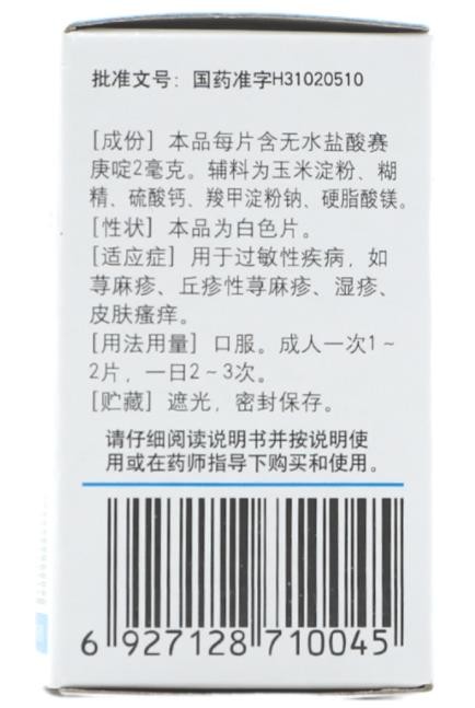【成份】本品每片含主要成份鹽酸賽庚啶2毫克,輔料為淀粉、糊精、硫酸鈣、硬脂酸鎂。