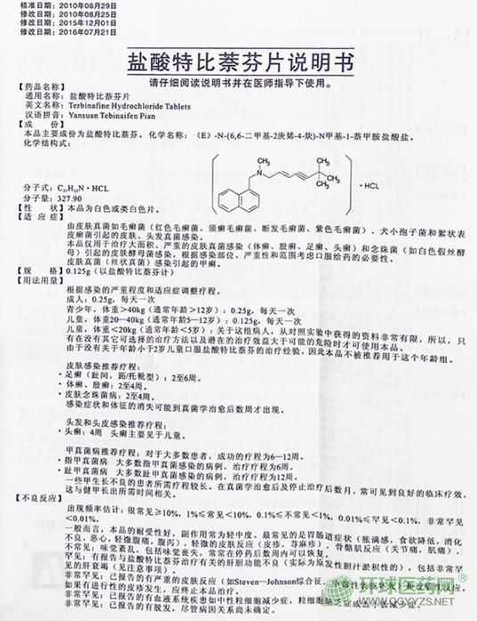 - 本頁面信息僅供參考,請以產(chǎn)品實際附帶說明書為準。 蘭美抒 鹽酸特比萘芬片 說明書文字版 【藥品名稱】 通用名稱:鹽酸特比萘芬片