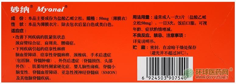- 本頁(yè)面信息僅供參考,請(qǐng)以產(chǎn)品實(shí)際附帶說(shuō)明書(shū)為準(zhǔn)。 鹽酸乙哌立松片 (妙納)外包裝 鹽酸乙哌立松片 (妙納)說(shuō)明書(shū)圖片版(