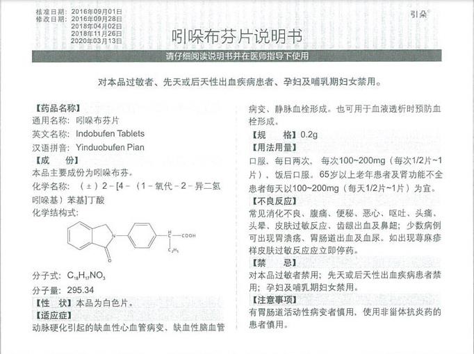 - 本頁面信息僅供參考,請以產(chǎn)品實際附帶說明書為準。 辛貝吲哚布芬片 外包裝 辛貝 吲哚布芬片 說明書(2010版