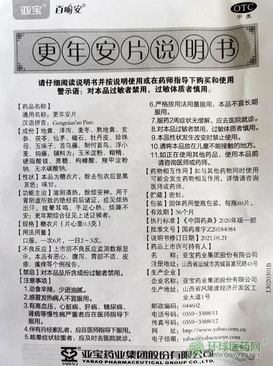 - 本頁(yè)面信息僅供參考,請(qǐng)以產(chǎn)品實(shí)際附帶說(shuō)明書(shū)為準(zhǔn)。 亞寶藥業(yè)更年安片(百喻安)外包裝 亞寶藥業(yè)更年安片(百喻安)說(shuō)明書(shū)