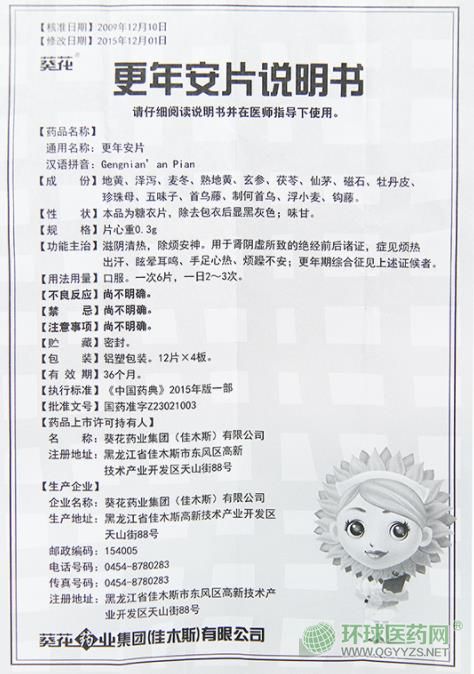 - 本頁(yè)面信息僅供參考,請(qǐng)以產(chǎn)品實(shí)際附帶說(shuō)明書(shū)為準(zhǔn)。 更年安片執(zhí)行標(biāo)準(zhǔn):中國(guó)藥典2015年版一部。 葵花牌 更年安片 外包裝