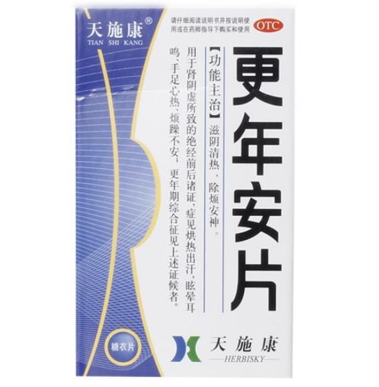 - 本頁(yè)面信息僅供參考,請(qǐng)以產(chǎn)品實(shí)際附帶說(shuō)明書(shū)為準(zhǔn)。 天施康更年安片 包裝 天施康更年安片使用說(shuō)明書(shū) 【藥品名稱(chēng)】通用