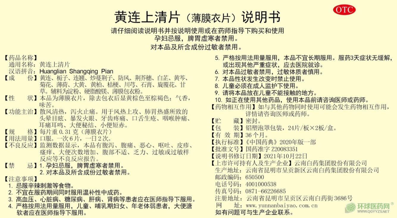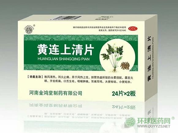 中成藥、OTC甲類、醫(yī)保甲類。用于風(fēng)熱上攻、肺胃熱盛所致的頭暈?zāi)垦、暴發(fā)火眼、牙齒疼痛、口舌生瘡、咽喉腫痛、耳痛耳鳴、大便秘結(jié)、小便短赤。吉林省圣達(dá)藥業(yè)有限公司、吉林省金泓醫(yī)藥有限公司、盛瑞藥業(yè)集團(tuán)、河南省國(guó)藥醫(yī)藥集團(tuán)有限公司等企業(yè)在環(huán)球醫(yī)藥網(wǎng)招商。【藥品名稱】通用名稱:黃連上清片