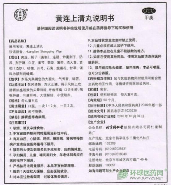 - 本頁面信息僅供參考,請以產(chǎn)品實際附帶說明書為準。 同仁堂黃連上清丸 說明書文字版 【藥品名稱】 通用名稱:黃連上清丸 商品