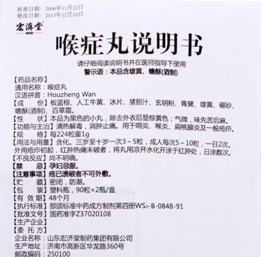中成藥、處方藥、非醫(yī)保。清熱解毒,消腫止痛。用于咽炎、喉炎、扁桃腺炎及一般瘡癤。多家企業(yè)生產(chǎn)。目前西安阿房宮藥業(yè)股份有限公司在環(huán)球醫(yī)藥網(wǎng)招商。【藥品名稱】通用名稱:喉癥丸