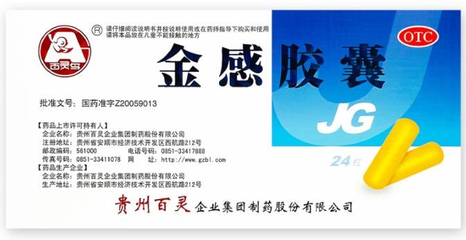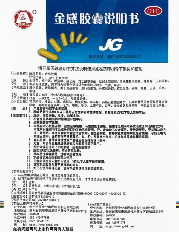 - 本頁(yè)面信息僅供參考,請(qǐng)以產(chǎn)品實(shí)際附帶說(shuō)明書為準(zhǔn)。 貴州百靈 金感膠囊 外包裝 貴州百靈金感膠囊說(shuō)明書(2020版) 【藥品