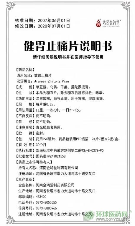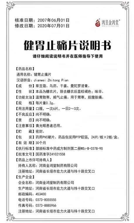 - 本頁面信息僅供參考,請以產(chǎn)品實際附帶說明書為準。 金鴻堂 健胃止痛片 說明書文字版 【藥品名稱】通用名稱:健胃止痛片 【成份】