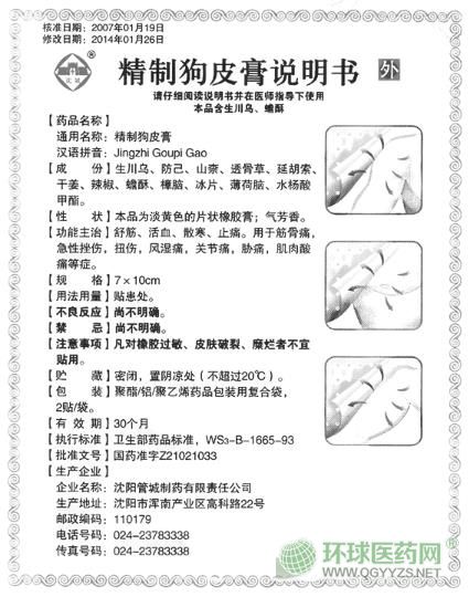 - 本頁面信息僅供參考,請以產(chǎn)品實際附帶說明書為準(zhǔn)。 坤世堂 精制狗皮膏 說明書文字版 【生產(chǎn)企業(yè)】 沈陽管城制藥有限責(zé)任公司 【