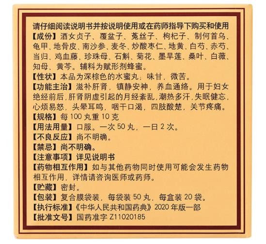【功能主治】滋補(bǔ)肝腎,鎮(zhèn)靜安神,養(yǎng)血通絡(luò)。用于婦女絕經(jīng)前后,肝腎陰虛引起的月經(jīng)紊亂,潮熱多汗,失眠健忘,心煩易怒,頭暈耳鳴,咽干口渴,四肢酸楚,關(guān)節(jié)疼痛。
