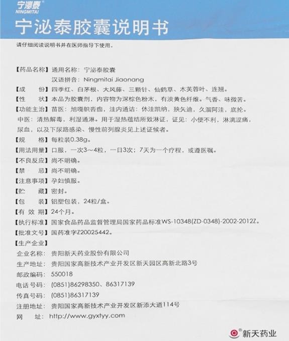 中成藥、處方藥、醫(yī)保乙類。苗醫(yī):旭嘎幟沓痂,洼內(nèi)通詰:休洼凱納,殃矢迪,久溜阿洼,底掄。中醫(yī):清熱解毒,利濕通淋。用于濕熱蘊(yùn)結(jié)所致淋證,證見:小便不利,淋漓澀痛,尿血,以及下尿路感染、慢性前列腺炎見上述證候者。由貴陽新天藥業(yè)股份有限公司生產(chǎn),目前在環(huán)球醫(yī)藥網(wǎng)招商。【藥品名稱】通用名稱:寧泌泰膠囊