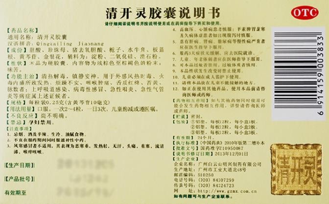 - 本頁(yè)面信息僅供參考,請(qǐng)以產(chǎn)品實(shí)際附帶說(shuō)明書(shū)為準(zhǔn)。 廣州白云山明興 清開(kāi)靈膠囊 外包裝 廣州白云山 明興清開(kāi)靈膠囊 說(shuō)