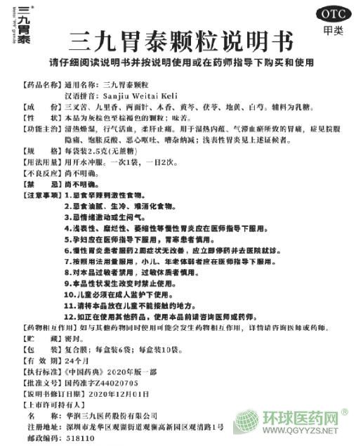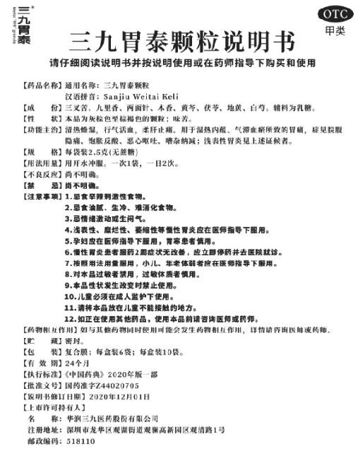 西藥、OTC甲類、醫(yī)保甲類。清熱燥濕,行氣活血,柔肝止痛,消炎止痛,理氣健脾。用于上腹隱痛,飽脹,反酸,惡心,嘔吐,納減,心口嘈雜。華潤(rùn)三九醫(yī)藥股份有限公司生產(chǎn)。【藥品名稱】通用名稱:三九胃泰顆粒