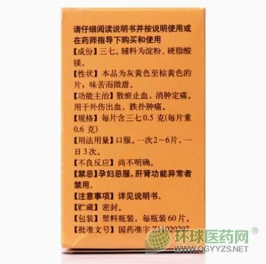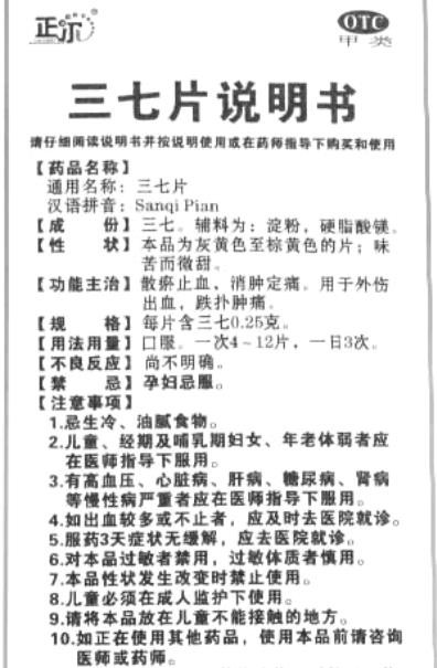 中成藥、OTC甲類(lèi)、醫(yī)保甲類(lèi)。散瘀止血,消腫定痛。用于外傷出血,跌撲腫痛。多家企業(yè)生產(chǎn)。目前湖北美寶藥業(yè)股份有限公司、湖北濟(jì)安堂藥業(yè)股份有限公司在環(huán)球醫(yī)藥網(wǎng)招商。【藥品名稱(chēng)】通用名稱(chēng):三七片