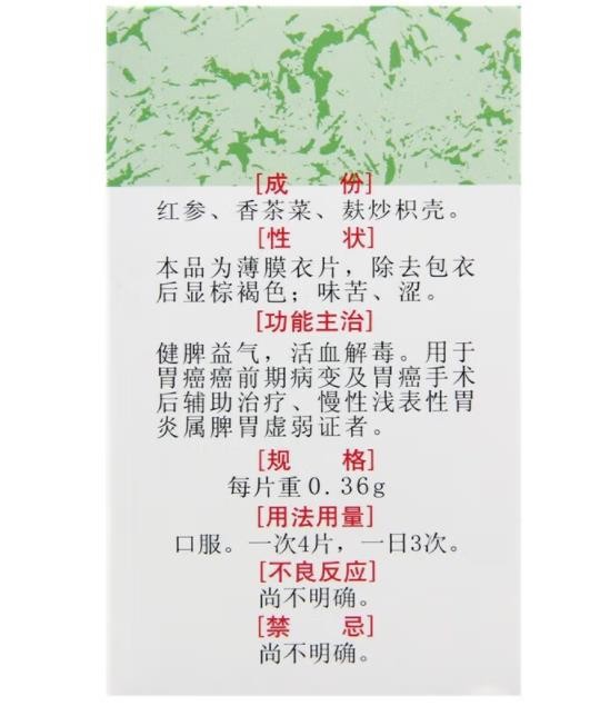 【功能主治】健脾益氣、活血解毒。用于治療胃癌癌前期病變、胃癌手術(shù)后輔助治療。慢性淺表性胃炎屬脾胃虛弱證者。