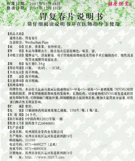 中成藥、處方藥、醫(yī)保乙類。健脾益氣、活血解毒。用于治療胃癌癌前期病變、胃癌手術(shù)后輔助治療。慢性淺表性胃炎屬脾胃虛弱證者。由杭州胡慶余堂藥業(yè)有限公司生產(chǎn),批準(zhǔn)文號(hào):國藥準(zhǔn)字Z20040003。目前在環(huán)球醫(yī)藥網(wǎng)招商。【藥品名稱】通用名稱:胃復(fù)春片