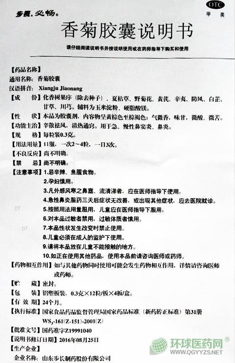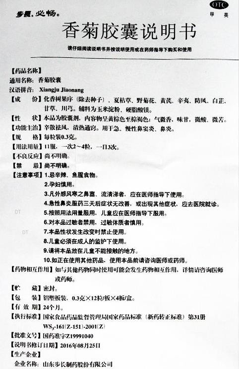 中成藥、OTC甲類、醫(yī)保甲類。辛散祛風,清熱通竅。用于急、慢性鼻竇炎,鼻炎。由山東步長制藥股份有限公司生產(chǎn),批準文號:國藥準字Z19991040。目前山東步長制藥股份有限公司在環(huán)球醫(yī)藥網(wǎng)招商。【藥品名稱】通用名稱:香菊膠囊