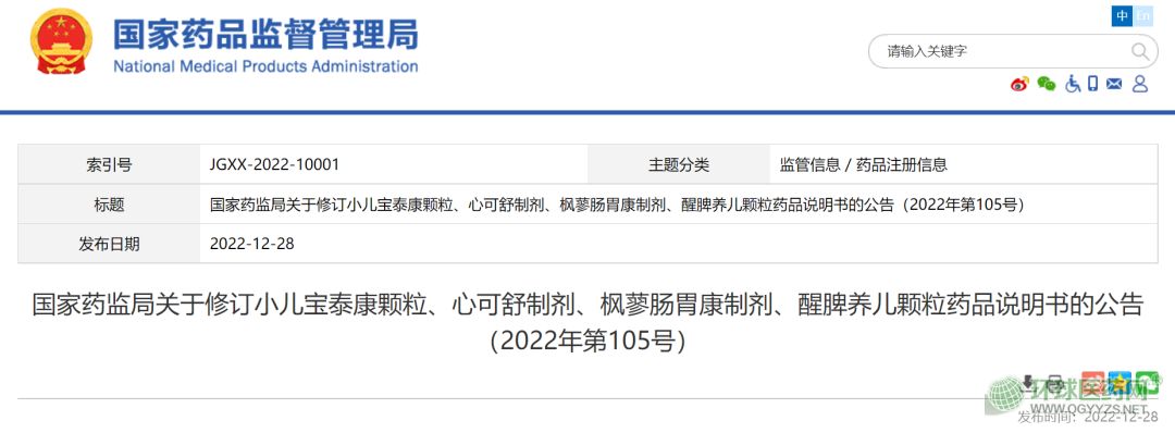 - 12月28日,國(guó)家藥品監(jiān)督管理局對(duì)小兒寶泰康顆粒、心可舒制劑、楓蓼腸胃康制劑、醒脾養(yǎng)兒顆粒藥品說(shuō)明書(shū)中的【不良反應(yīng)】、【禁忌】和【注