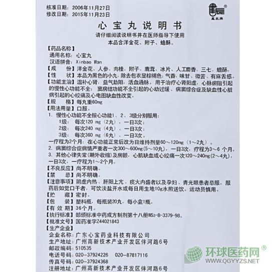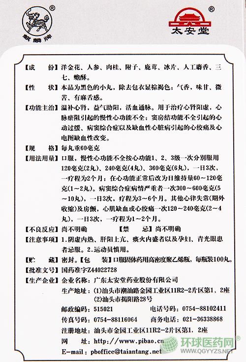 中成藥、處方藥、醫(yī)保乙類。溫補心腎,益氣助陽,活血通脈。用于治療心腎陽虛,心脈瘀阻引起的慢性心功能不全;竇房結(jié)功能不全引起的心動過緩、病竇綜合癥以及缺血性心臟病引起的心絞痛及心電圖缺血性改變。廣東太安堂藥業(yè)股份有限公司、廣東心寶藥業(yè)科技有限公司生產(chǎn)。【藥品名稱】通用名稱:心寶丸