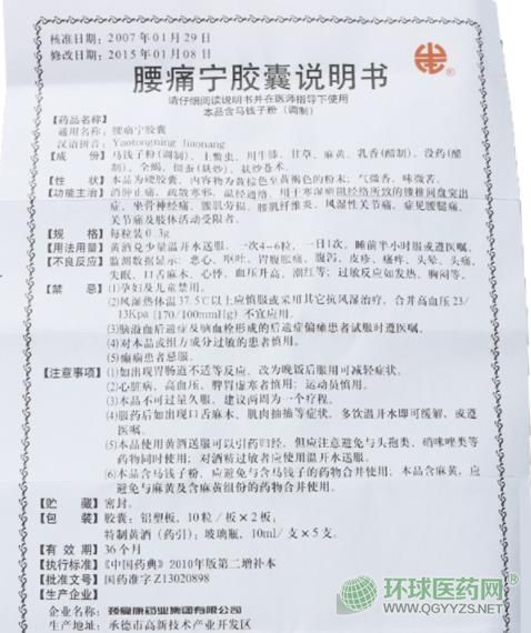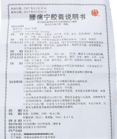 中成藥、處方藥、醫(yī)保乙類(lèi)。消腫止痛,疏散寒邪,溫經(jīng)通絡(luò)。用于腰椎間盤(pán)突出癥、腰椎增生癥、坐骨神經(jīng)痛、腰肌勞損、腰肌纖維炎、慢性風(fēng)濕性關(guān)節(jié)炎。由頸復(fù)康藥業(yè)集團(tuán)有限公司生產(chǎn)。【藥品名稱(chēng)】通用名稱(chēng):腰痛寧膠囊