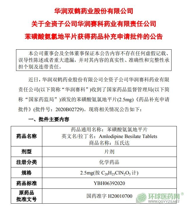 - 華潤(rùn)雙鶴 苯磺酸氨氯地平片 獲藥品補(bǔ)充申