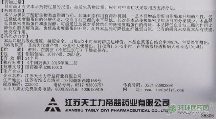 本品為氯貝丁酸衍生物類血脂調(diào)節(jié)藥。其降血脂作用有兩種機制,一是本品增高脂蛋白脂酶和肝脂酶活性,促進極低密度脂蛋白的分解代謝,使血甘油三酯的水平降低。其次是本品使極低密度脂蛋白的分泌減少。本品降低血低密度脂蛋白和膽固醇,可能通過加強對受體結(jié)合的低密度脂蛋白的清除。本品降低血甘油三酯的作用比降低血膽固醇為強,也使高密度脂蛋白升高。此外本品尚可降低血纖維蛋白原。已有的研究未發(fā)現(xiàn)本品有致癌、致突變作用。