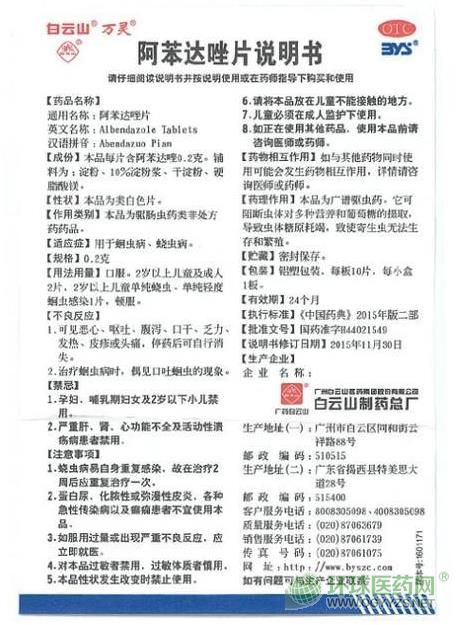 - 本頁面信息僅供參考,請以產(chǎn)品實(shí)際附帶說明書為準(zhǔn)。 廣州白云山 萬靈 阿苯達(dá)唑片 說明書文字版 【藥品名稱】 通用名稱: